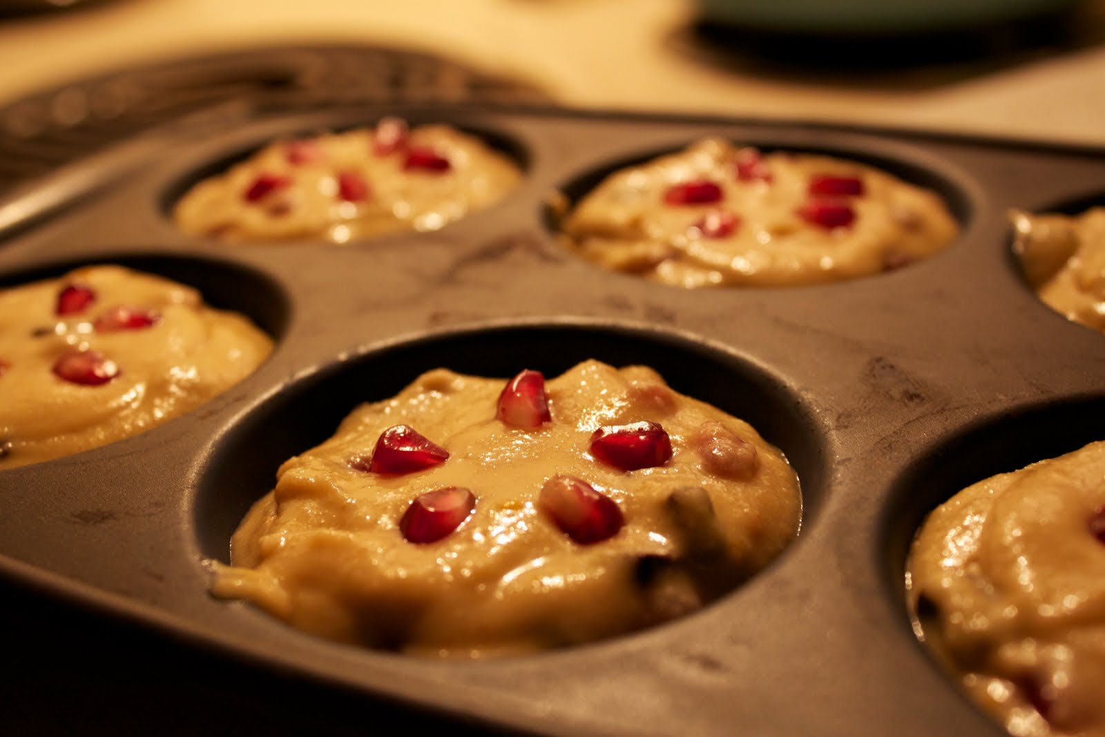 Combine all your ingredients well, stirring in the pomegranate arils and chocolate chips carefully at the end. Bake at 350 degrees for 20-25 minutes or until golden brown and gorgeous.
